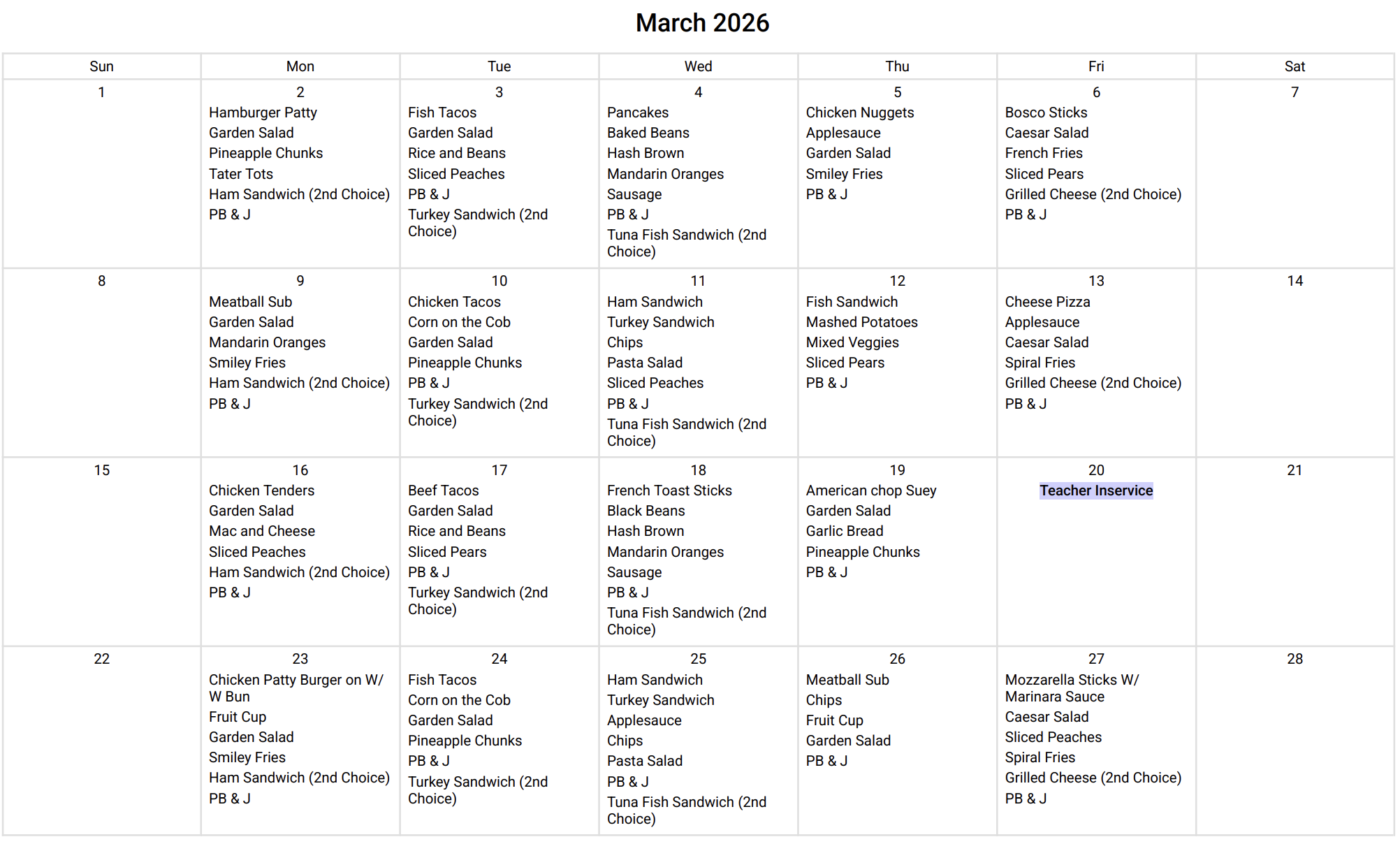 MARCH LUNCH MENU
